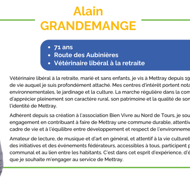 Adhérent depuis sa création à l’association Bien Vivre au Nord de Tours, je souhaite poursuivre cet engagement en contribuant à faire de Mettray une commune durable, attentive à la préservation de son cadre de vie et à l’équilibre entre développement et respect de l’environnement.