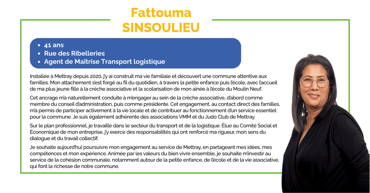 Je souhaite aujourd’hui poursuivre mon engagement au service de Mettray, en partageant mes idées, mes compétences et mon expérience. Animée par les valeurs du bien vivre ensemble, je souhaite m’investir au service de la cohésion communale, notamment autour de la petite enfance, de l’école et de la vie associative, qui font la richesse de notre commune.