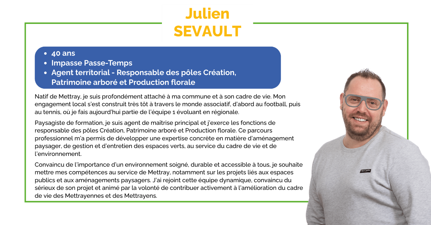 Convaincu de l’importance d’un environnement soigné, durable et accessible à tous, je souhaite mettre mes compétences au service de Mettray, notamment sur les projets liés aux espaces publics et aux aménagements paysagers. J’ai rejoint cette équipe dynamique, convaincu du sérieux de son projet et animé par la volonté de contribuer activement à l’amélioration du cadre de vie des Mettrayennes et des Mettrayens.