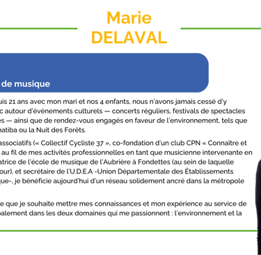 Par mes engagements associatifs -Collectif Cycliste 37, co-fondation d’un club CPN « Connaître et Protéger la Nature » - et au fil de mes activités professionnelles en tant que musicienne intervenante en milieu scolaire, coordinatrice de l’école de musique de l’Aubrière à Fondettes (au sein de laquelle j’enseigne encore à ce jour), et secrétaire de l’U.D.E.A -Union Départementale des Établissements d’Enseignement Artistique-, je bénéficie aujourd’hui d’un réseau solidement ancré dans la métropole tourangelle.