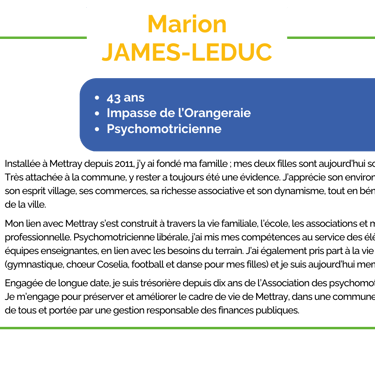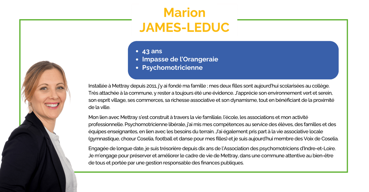 Engagée de longue date, je suis trésorière depuis dix ans de l’Association des psychomotriciens d’Indre-et-Loire. Je m’engage pour préserver et améliorer le cadre de vie de Mettray, dans une commune attentive au bien-être de tous et portée par une gestion responsable des finances publiques.