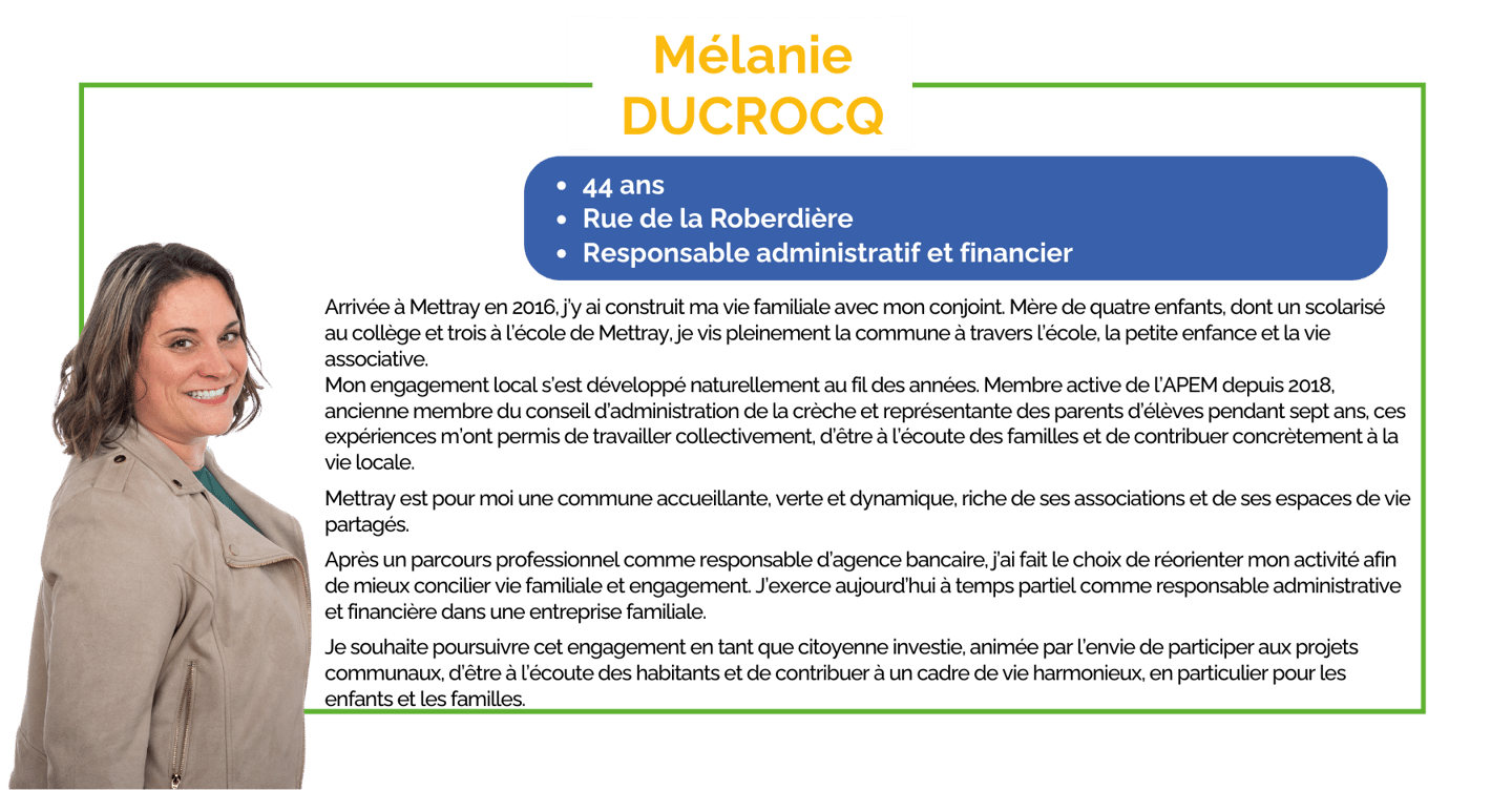 Arrivée à Mettray en 2016, j’y ai construit ma vie familiale avec mon conjoint. Mère de quatre enfants, dont un scolarisé au collège et trois à l’école de Mettray, je vis pleinement la commune à travers l’école, la petite enfance et la vie associative.