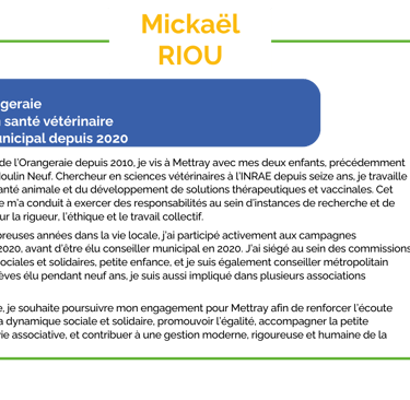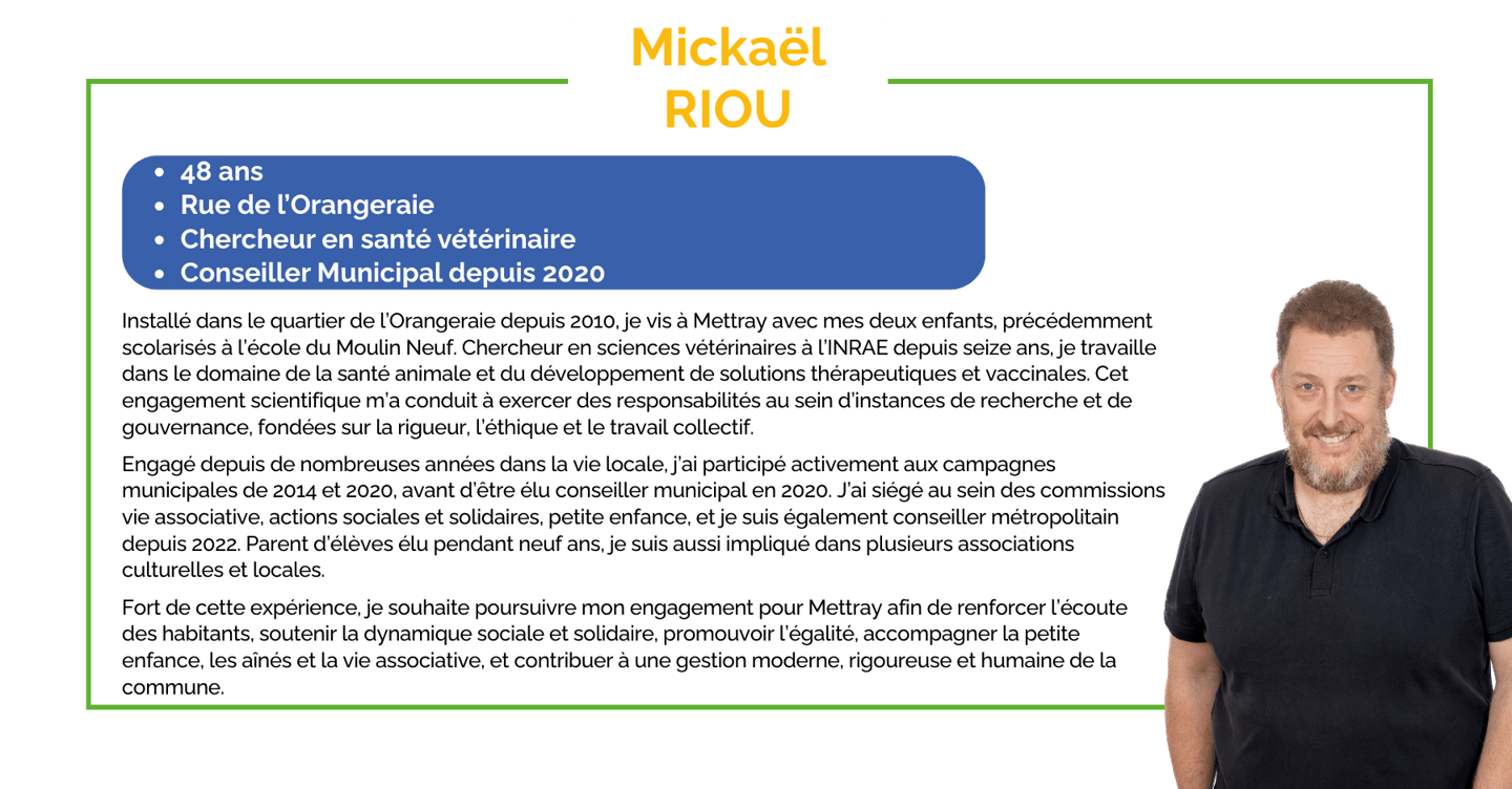 Installé dans le quartier de l’Orangeraie depuis 2010, je vis à Mettray avec mes deux enfants, précédemment scolarisés à l’école du Moulin Neuf. Chercheur en sciences vétérinaires à l’INRAE depuis seize ans, je travaille dans le domaine de la santé animale et du développement de solutions thérapeutiques et vaccinales. Cet engagement scientifique m’a conduit à exercer des responsabilités au sein d’instances de recherche et de gouvernance, fondées sur la rigueur, l’éthique et le travail collectif.
