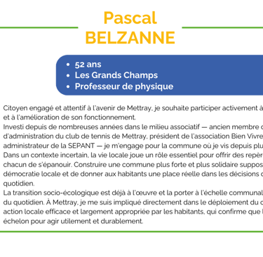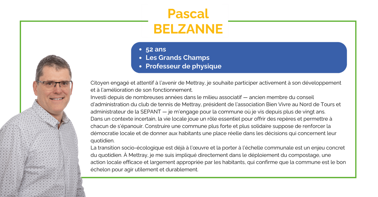 Investi depuis de nombreuses années dans le milieu associatif — ancien membre du conseil d’administration du club de tennis de Mettray, président de l’association Bien Vivre au Nord de Tours et administrateur de la SEPANT — je m’engage pour la commune où je vis depuis plus de vingt ans.