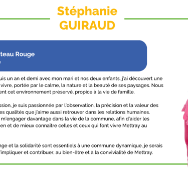 Convaincue que l’échange et la solidarité sont essentiels à une commune dynamique, je serais heureuse de pouvoir m’impliquer et contribuer, au bien-être et à la convivialité de Mettray.