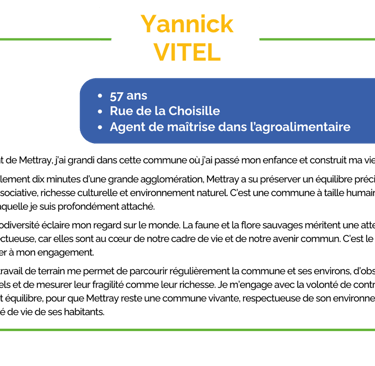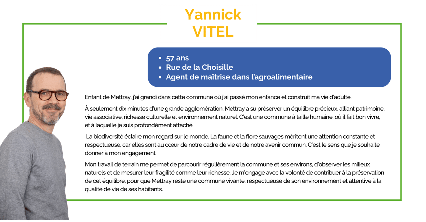 Mon travail de terrain me permet de parcourir régulièrement la commune et ses environs, d’observer les milieux naturels et de mesurer leur fragilité comme leur richesse. Je m’engage avec la volonté de contribuer à la préservation de cet équilibre, pour que Mettray reste une commune vivante, respectueuse de son environnement et attentive à la qualité de vie de ses habitants.